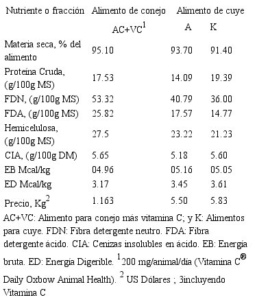 Teniendo en cuenta que los conejos no requieren grandes cantidades de vitamina C, es posible que los alimentos comerciales para estos lagomorfos contengan menos de 200 mg/kg de alimento de vitamina C, la cual es la concentración requerida para el cuye (5). Por lo tanto, se realizó un experimento para evaluar la digestibilidad, el crecimiento y el rendimiento de cuyes alimentados con dos alimentos especialmente formulados para esta especie y un alimento comercial para conejos en crecimiento con suplementación de vitamina C.