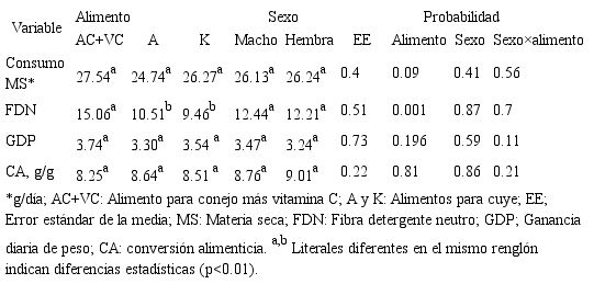 Abstract: Objetive. An experiment was conducted to evaluate the feed intake, digestibility and growth of pigs fed with two feeds (A and K) specially formulated for this species and a commercial feed for growing rabbits with supplementation of vitamin C (RF+VC). Materials and methods. Eighteen Guinea pigs of 248±38 g initial body weight were distributed in a completely randomized design with factorial arrangement 3×2 (dietary treatments and sex). Feed and neutral detergent fiber intake, weight gain, feed/gain, and morphometric variables were measured individually for 30 days. Dry matter and neutral detergent fiber digestibility were measured during the last seven days of the experiment. Results. There were no differences on feed intake (p=0.88); however, the dry matter digestibility was higher (p<0.01) in feeds formulated for Guinea pigs (A and K) and lower in the rabbit feed plus vitamin C. The intake and digestibility of NDF were higher in the RF+VC and lower in feeds for Guinea pigs (p< 0.01). The average daily gain was similar among the treatments (p>0.05). There were no differences (p>0.01) in the morphometric variables among dietary treatments, but there were sex differences as the males were bigger than the females (p<0.01). Conclusions. The results indicate that Guinea pigs can be fed with rabbit feed supplemented with vitamin C.