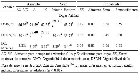 La ganancia diaria promedio (GDP) fue similar entre los tratamientos (p>0.05)(Tabla 2) y, como consecuencia, no se detectaron diferencias significativas en la conversión alimenticia (p>0.05). En cuanto a la digestibilidad, hubo diferencias significativas (p≤0.01) en todas las fracciones analizadas con valores más altos en DM y DE en alimento especialmente formulado para cuyes, mientras que la digestibilidad de la FDN fue mayor (p≤0.01) en el alimento para conejo (Tabla 3).