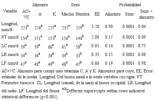 Ganancia diaria de peso, conversión alimenticia y variables morfométricas. Durante un período de 30 días, los cuyes se pesaron cada siete días para determinar la ganancia diaria promedio. La conversión alimenticia (A:G) se calculó para el total del experimento. Las medidas morfométricas evaluadas incluyeron: la longitud corporal (hueso nasal hasta la sexta vértebra coccígea), circunferencia del tórax, longitud craneal, longitud del fémur y longitud del radio. Todas las variables morfométricas se registraron al comienzo y al final del experimento.