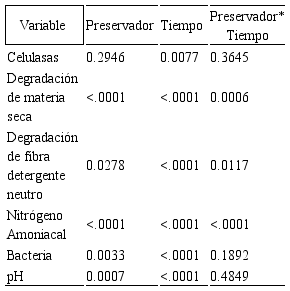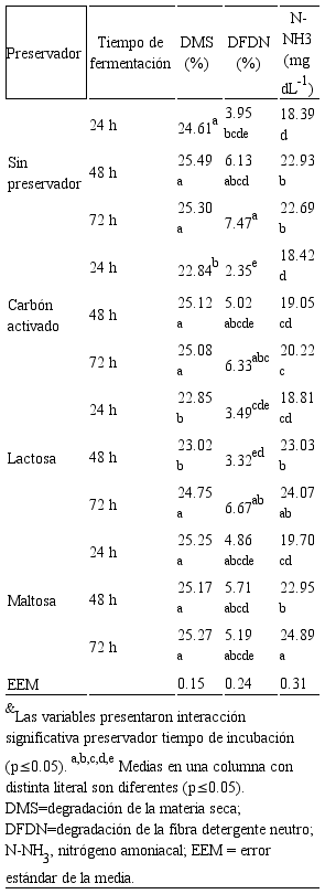 La tabla 3 muestra el valor de p de los factores principales y su interacción; ya que la fermentación in vitro se realizó a diferentes tiempos para ver los cambios conforme aumentaba el tiempo de fermentación (Tabla 4). El SP no mostró diferencias (p>0.05) en la degradación de la materia seca en los tiempos de fermentación evaluados (Tabla 4). Todos los preservadores (SP, LA, MA y CA) no tuvieron diferencias (p>0.05) en la DMS a las 72 h de incubación. Los preservadores SP, CA, LA y MA no presentaron diferencias (p>0.05) en la degradación de la FDN (DFDN) a las 24, 48 y 72 h (Tabla 4), promediando 3.7, 5.0 y 6.4% DFDN, respectivamente.