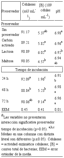 La actividad enzimática de celulasas no mostró diferencias entre preservadores (p>0.05), promediando 90.33 mU mL-1. En contraste, por tiempo de incubación, a las 24 h se observó 3.6% mayor (p≤0.05) actividad celulasas que a las 48 h; mientras, a las 72 h la actividad no mostró diferencias (p>0.05) con el resto de los tiempos de incubación (Tabla 5).