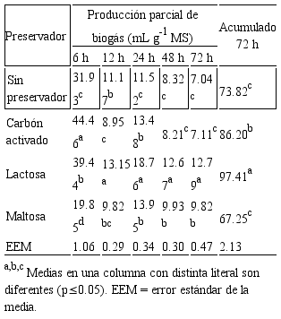 El preservador LA produjo mayor biogás acumulado (p≤0.05) a las 72 h. La producción de biogás de LA y CA fue 31.9 y 16.8% superior (p≤0.05) a SP (testigo). MA y SP no presentaron diferencias (p>0.05) en la producción de biogás acumulada a las 72 h (Tabla 2). En la producción parcial, CA produjo mayor (p≤0.05) biogás a las 6 h, pero LA produjo mayor (p≤0.05) biogás que el resto de los preservadores a partir de las 12 h (Tabla 2). LA aumentó 52.3 y 81.8% la producción de biogás a las 48 y 72 h (p≤0.05), con respecto a SP; CA no fue diferente (p>0.05) a SP a las 48 y 72 h; mientras, MA aumentó (p≤0.05) 19.4 y 39.5% a las 48 y 72 h de incubación (Tabla 2).