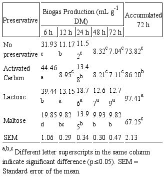 Results analysis. A completely randomized design was used to analyze biogas production at 6, 12, 24, 48 and 72 h, and accumulated production at 72 h (10 independent samples). Means were compared with the Tukey test (p≤0.05). The statistical model was Yij = μ + τi + εij; where: Yij = response variable in the i-th preservative and j-th repetition; μ = general mean; Τi = effect of the i-th preservative; and Εij = random error, normally distributed with a mean of 0 and σ2 variance.
