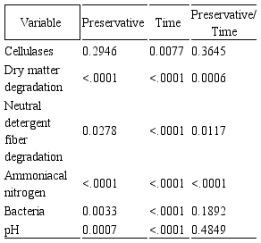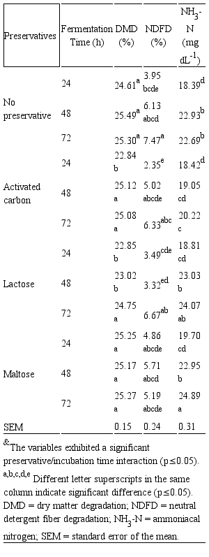 Because in vitro fermentation was done at different times, analyses were done of the main factors and their interactions (Table 3) to document any changes as fermentation time increased (Table 4). In the NP treatment (control) dry matter degradation (DMD) values did not differ (p>0.05) between the evaluated fermentation times (Table 4). None of the four preservative treatments (NP, LA, MA and AC) exhibited differences (p>0.05) in DMD at 72 h incubation. Likewise NDFD did not differ (p>0.05) between the three incubation times in any of the treatments (Table 4); it averaged 3.7% at 24 h, 5.0% at 48 h and 6.4% at 72 h.