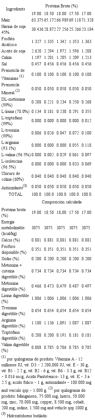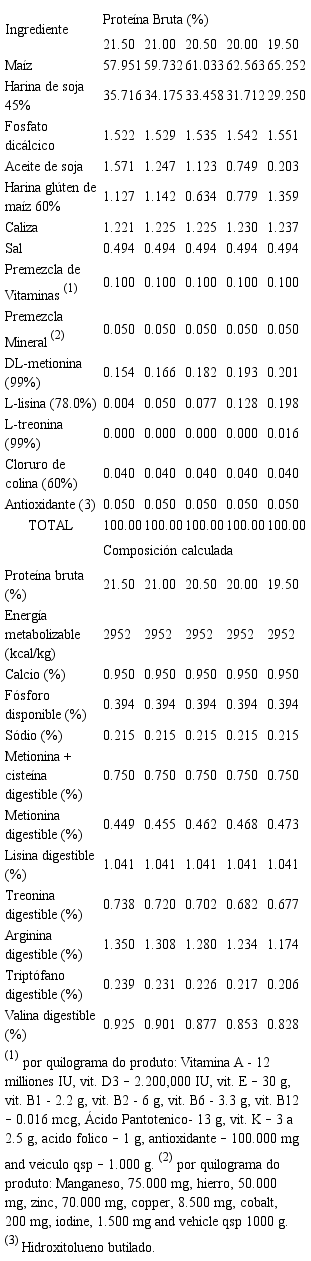 Para cada fase experimental, se formularon dietas compuestas principalmente de maíz y harina de soya, para ser isoenergéticas y cumplir con todas las exigencias nutricionales de los pollos. Las dietas fueron formuladas siguiendo las tablas nutricionales de Rostagno et al (3) para pollos de desempeño regular, excepto para proteína bruta. Por otro lado, los cálculos descritos por Nagib et al (4), Pinheiro et al (5) y Pinheiro et al (6) se utilizaron respectivamente para atender los requerimientos nutricionales de lisina digestible, fósforo disponible y calcio.