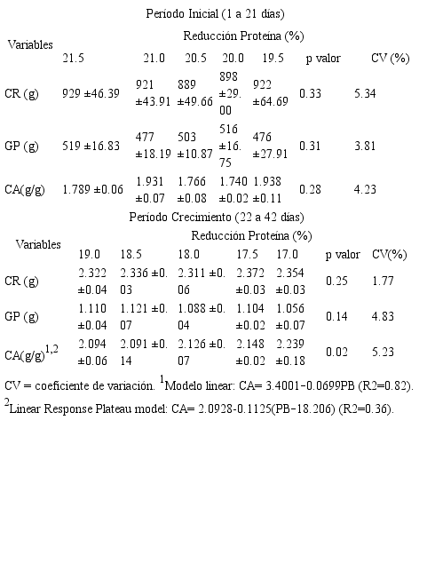 Los datos muestran, que, para el período inicial, de 1 a 21 días de edad, que la reducción de proteína no influyó en las características evaluadas.