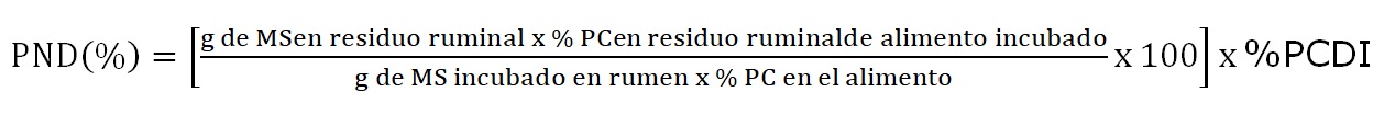 PND: Proteína no degradable en rumen (%), MS: Materia seca (g), CP: Proteína cruda (%), PCDI: Proteína cruda digestible en el intestino (%), CMS: Consumo de materia seca (g).