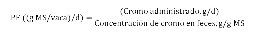 CMSf = Consumo de materia seca del forraje, kg/vaca/día, PF = Producción fecal total, kg MS/día, LDA heces = Lignina detergente ácido encontrada en animales, %, LDAc = Lignina detergente ácido del alimento concentrado, %, CMSc = Consumo de materia seca del alimento concentrado, kg/vaca/día, LDAf = Lignina detergente ácido del forraje. Se asumió una tasa de recuperación de cromo en heces del 80% (12). El CMS del total se determinó como el CMS total (CMSt) más el CMS del suplemento.