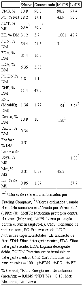 La composición química de los piensos evaluados se muestra en la tabla 1. El programa AminoCow (7) se usó para estimar los requerimientos de aminoácidos. El programa mostró que los suministros dietarios generan una deficiencia del 29,7% y 20,5% de metionina y lisina, respectivamente. Para el grupo experimental, se agregó metionina protegida contra el rumen (Mepron ® , Evonik, Degussa AG, Alemania) y lisina protegida contra el rumen (AjiProTM-L Ajinomoto, Tokio, Japón) en la dieta de las vacas. Para ello, se liberaran dentro del intestino delgado 7.03+2.93 g de metionina y 23.9+3.82 g de lisina. Las vacas recibieron la dieta experimental desde el día 0 al 20 de experimentación.