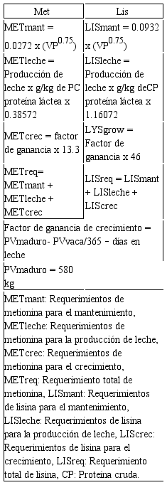 Estimación de los requerimientos de Met y Lis. Los requerimientos de estimación individual para el mantenimiento, la producción de leche y el crecimiento corporal (Tabla 1) se calcularon con base en el peso vivo (PV), los días en leche, la edad, la producción de leche y el porcentaje de proteína (%). Las mediciones se ingresaron en el programa AC (7).