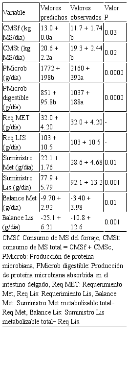 Bajo las condiciones del sistema de pastoreo, los valores predichos y observados de consumo de materia seca del forraje y consumo de materia seca total fueron diferentes; por ello, los valores de proteína microbiana y endógena difieren de los valores predichos.