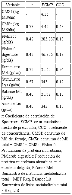 Los resultados confirman que los valores predichos no exhibieron ni precisión ni exactitud en comparación con los valores observados. Bajo las condiciones del sistema de pastoreo, los valores predichos y observados del consumo de materia seca del forraje y el consumo total de materia seca fueron diferentes; por esta razón, los valores observados de proteína microbiana y endógena difieren de los valores predichos para esta variable.