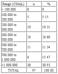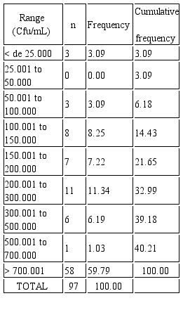 Only 3.09% of the samples had counts less than 50000 CFU/mL (Table 2), indicating excellent microbiological quality, and the same percentage had counts of 100000 CFU/mL (Table 2), classified as normal milk quality. 93.82% of the mesophilic counts were high. The presence of high mesophilic count may have been due to inadequate milk transport and sales, lack of a cold chain, high environmental temperatures, prolonged sale times and collection of inappropriate materials (2,26).