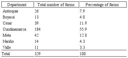 Type of study: A cross-sectional study was performed to determine the frequency of anti-BLV antibodies in multiple dairy farms. From the 2200 samples submitted in a fortnight for quality analyses, 329 samples from seven departments were analyzed with an error margin of 5% and a confidence level of 95%.