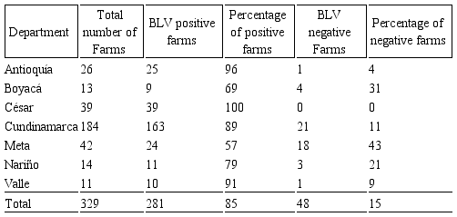 The main result of this study was the widespread of anti-BLV antibodies in farms (57–100%). This is consistent with the reported BLV seroprevalence in Colombia (8,9,10,11,12), although the percentages of positive samples were larger in our study. In the USA and Canada, studies using bulk tank milk samples reported frequencies larger than the mean frequency reported here (2,5).