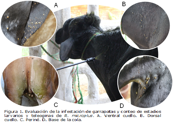 Para la evaluación del efecto de los extractos en los bovinos se realizó la metodología descrita por Bianchi et al (3), en la cual teleoginas (garrapatas >4.5 y <8 mm de longitud corporal) y larvas (garrapatas <4.5 mm de longitud corporal) fueron contadas del lado derecho del cuerpo del bovino, específicamente en 4 áreas de 10 cm2: aspecto ventrolateral y dorsolateral cervical, base de la cola y periné (Figura 1).
