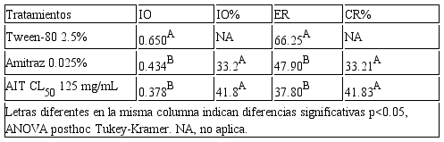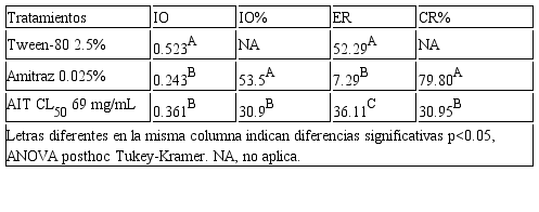 Con la IO y el E% se calculó la ER, así: ER=IOxE%. La ER de cada grupo de garrapatas tratado se comparó con la ER de los grupos control positivo y control negativo; luego se calculó el CR%, así:
