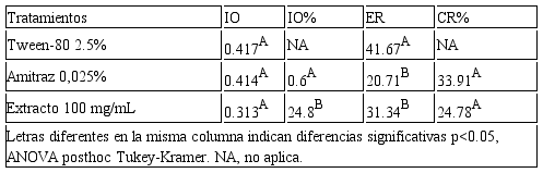 Pruebas in vitro. Se aplicó la prueba AIT propuesta por Drummond et al (9), con adaptaciones. Las teleoginas fueron seleccionadas de acuerdo a su morfología, motilidad y máximo de ingurgitamiento; luego pesadas y separadas en grupos de 10 con pesos homogéneos. Seis repeticiones para cada concentración incluyendo el grupo control negativo (agua-Tween 80 2.5%) y el control positivo Amitraz 0.025% se desarrollaron, donde las teleoginas se expusieron a los extractos en concentraciones decrecientes de 320, 160, 80, 40, 20 y 10 mg/mL vehiculizados en agua-Tween 80 2.5%; sumergiéndolas en 10 mL de estas soluciones durante 10 minutos, después secadas y colocadas en cajas de Petri plásticas, luego incubadas en las mismas condiciones descritas con anterioridad.