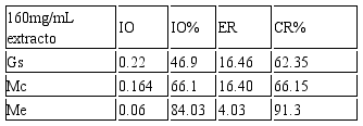 Datos similares fueron reportados por Álvarez et al (15) donde el extracto alcohólico de Gs mostró un efecto signifcativo (p<0.05) sobre el IO% en Rm del 94%. Así mismo sobre su capacidad acaricida se ha publicado que el extracto etanólico 5% de hojas de Gs redujo un 57% la ovoposición del acaro Tetranychuscinnabarinus, obtenido de plantas de frijol negro; además, concentraciones de 5, 10, 15, y 20% del extracto etanólico de la planta causaron 41.7, 80.6, 88.9 y 100% de mortalidad, respectivamente (14).