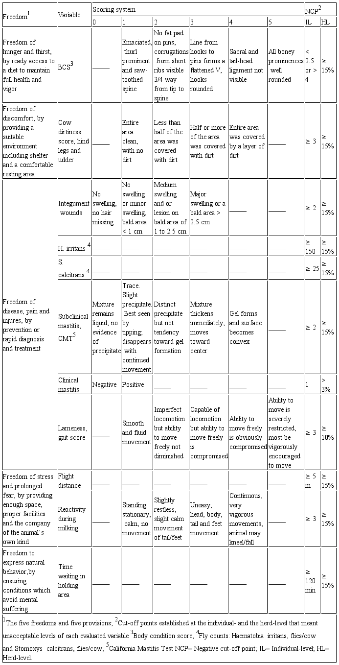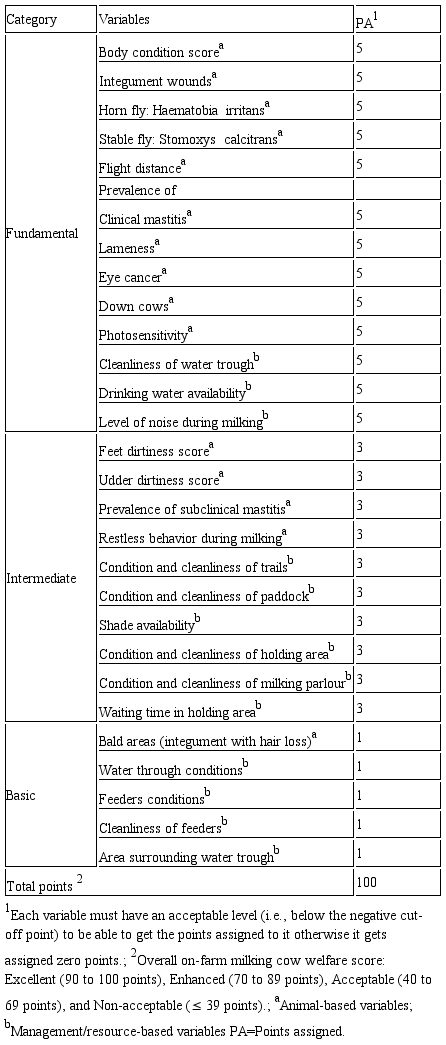 Abstract: Objectives. The aim of this study was to determine an overall on-farm animal welfare score (WS) for dairy farms using a protocol involving animal- and management/resource-based variables; and to identify the variables that contributed the most to the variance for the WS. Materials and methods. Twenty-five pasture-based dairy farms in Savanna of Bogota - Colombian high tropic, were visited twice. During each visit, a total of 15 animal- and 13 management/resource-based variables were evaluated. For each variable, a herd-level negative cut-off point was established to determine compliance. Based on compliance, a WS was determined (from 0 to 100) and farms were classified as ‘excellent’, ‘enhanced’, ‘acceptable’, or ‘non-acceptable’. A linear regression model was used to evaluate the association between variables at the herd-level with the WS. Results. Overall, median WS was 82 (min = 67; max = 97). Two farms were classified as ‘excellent’ (WS = 94.5), 20 as ‘enhanced’ (WS = 82.5), and 3 as ‘acceptable’ (WS = 68). Among all variables, the noncompliance regarding subclinical mastitis, hind-legs and udder dirtiness score, ventral line wounds,Haematobia irritans fly counts, and condition/cleanliness of pre-milking holding area was significantly associated with a 5.6, 3.6, 6.7, 5.1, 6.5, and 6.1 points reduction in the WS, respectively (R. = 0.84). Conclusions. Welfare level found across farms was good and encouraging. Nonetheless, six variables were identified as the main contributors to an unfavorable result. Strategies for improvement could focus on these variables to be able to reach a welfare level of ‘excellence’.