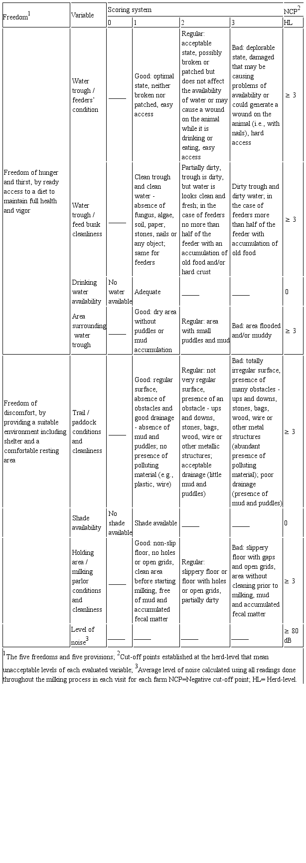 Management/resource-based measurements description.Table 2 summarizes the scoring charts used in this study. The condition and cleanliness of water trough and its surrounding area, feeders (i.e., buckets where concentrate is given to cows during milking), field (field where milking cows were kept on the day of the visit), trails (i.e., used by cows to go from the field to milking parlor in those farms without portable milking on pasture), pre-milking holding area, and milking parlor were assessed using a 3-point scale. Additionally, it was determined whether the field where cows were kept had shade (natural or artificial) and drinking water available for the animals. The time cows had to wait prior to be milked in the holding area was recorded for each individual animal as well as the level of noise at the milking parlor cows and workers were exposed to, using a sound meter (407750, Extech Instruments, Nashua, NH, USA). Ambient sound readings were done every 15 minutes throughout the milking process.