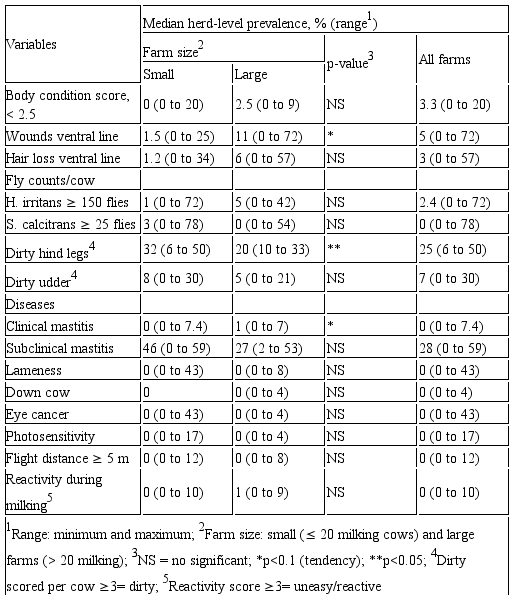 Regarding the presence of hematophagous flies, on average it was found that a cow had 56±64 Haematobia irritans (min=0, max= 326, n=773) and 9±18 Stomoxys calcitrans (min=0, max=136, n=772). In six farms (3 small and 3 large), more than 15% of the cows evaluated had Haematobiairritans counts ≥ 150 flies/cow. Similarly, six farms (5 small and 1 large) were above the acceptable cut-off point for Stomoxys calcitrans counts (<15% of the herd had 25 flies/cow).