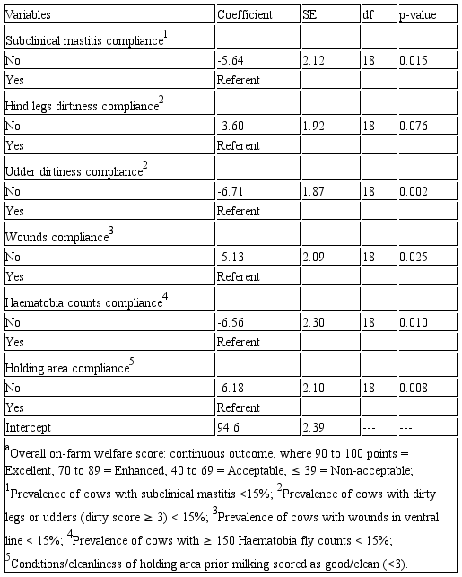 Linear regression model (PROC MIXED in SAS) was used to evaluate the association between animal-based, resource- and management-based variables at the herd level with the overall on-farm WS given to each farm. Each variable was dichotomized based on the negative cut-off point established at the herd-level, where 0 indicated compliance and 1 indicated noncompliance. Any variables having an association with WS at p<0.20 (univariable analysis) were offered to the multivariable model. A variable was considered a confounder when the difference between coefficients of the full model and reduced model was >20%. The model was reduced using backward elimination and variables remained in