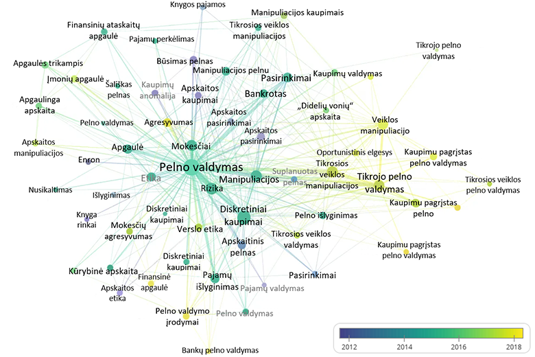 Norint surasti atsakymą, koks terminas turėtų būti naudojamas apibūdinant veiksmus, kuriais siekiama manipuliuoti apskaitos rezultatais, tikslinga įvertinti, kaip šis reiškinys yra įvardinamas moksle. Tuo tikslu buvo atliktas bibliografinis mokslinių publikacijų tyrimas. Remiantis Rudžionienės (2012) pastebėjimu, kad mokslininkai naudoja terminą „pelno valdymas“, jis bus laikomas atspirties tašku. Svetainėje „Web of Science“ „Core collection“ duomenų bazėje laikotarpyje nuo 1990 m. iki 2021 m. birželio mėn. buvo rastos 5562 paskelbtos publikacijos, kurių pavadinimuose, raktiniuose žodžiuose minimas terminas „pelno valdymas“, arba tai yra pagrindinė straipsnio tyrimo problema. Toliau analizuojant rastas publikacijas buvo ieškoma autorių nurodytų raktinių žodžių, kurie visuose straipsniuose kartotųsi ne mažiau, kaip 5 kartus. Atliktus visų straipsnių duomenų analizę buvo rasti 1266 raktiniai žodžiai, kurie naudojami tiriant pelno valdymo problemą, iš kurių buvo atrinkti tie raktiniai žodžiai, kurie tiesiogiai apibūdina pelno valdymą ir apskaitos manipuliacijų reiškinį. Analizės metu duomenys buvo apdorojami programos „VOSviewer“ pagalba ir atvaizduoti 1 pav.