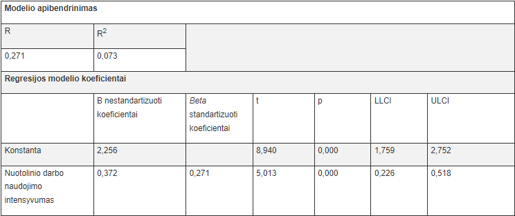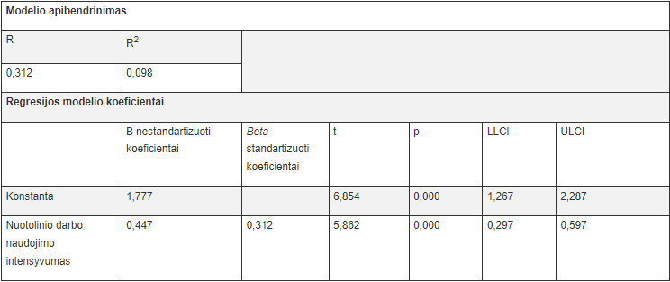 Antrojo tiesinės regresijos modelio determinacijos koeficientas R2 < 0.2 (modelio R2 = 0,098), parodo, kad nuotolinio darbo naudojimo intensyvumas paaiškina tik labai mažą dalį darbuotojo laiko, skirto sau. Vis dėlto gauta p reikšmė (0,000) rodo, kad šis modelis yra reikšmingas (kad modelis būtų tinkamas, p turėtų būti mažesnė nei 0,05). Todėl galima teigti, kad suvokiamas nuotolinio darbo naudojimo intensyvumas turi statistiškai reikšmingą (p=0,000, kas yra <0,05) teigiamą įtaką (beta standartizuotas koeficientas yra lygus 0,312) darbuotojo laikui, skirtam sau. Iš gautų rezultatų matyti, kad šiame modelyje nuotolinio darbo naudojimo intensyvumu būtų galima paaiškinti tik 9,8% balanso tarp darbo ir asmeninio gyvenimo dimensijos – laiko, skirto sau.