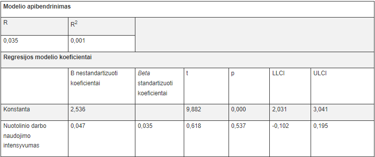 Iš gautų rezultatų matyti, kad šiame modelyje nuotolinio darbo naudojimo intensyvumu būtų galima paaiškinti tiktai 0,1% balanso tarp darbo ir asmeninio gyvenimo dimensijos – darbuotojo laiko, skirto darbui (regresijos modelį galima laikyti geru, jei R2≥0,20). Gauta p reikšmė (0,537) taip pat patvirtina, jog regresoriai yra menkai susiję su priklausomu kintamuoju (kad modelis būtų tinkamas, p turėtų būti mažesnė nei 0,05), todėl toliau nagrinėti šį modelį nėra prasmės – kaip paaiškinamasis kintamasis jis yra netinkamas.