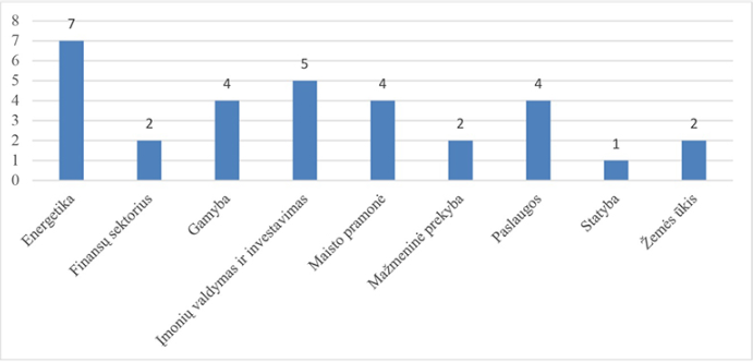 Kaip matyti iš 1 paveikslo, tyrimo imtis apėmė 9 skirtingų ūkio šakų įmones, iš kurių daugiausia buvo energetikos (7 įmonės), įmonių valdymo ir investavimo (5), gamybos, maisto pramonės bei paslaugų (po 4) įmonių. Finansų sektoriaus, žemės ūkio, mažmeninės prekybos (po 2) bei statybų (1) įmonių tyrimo imtyje buvo mažiausia.