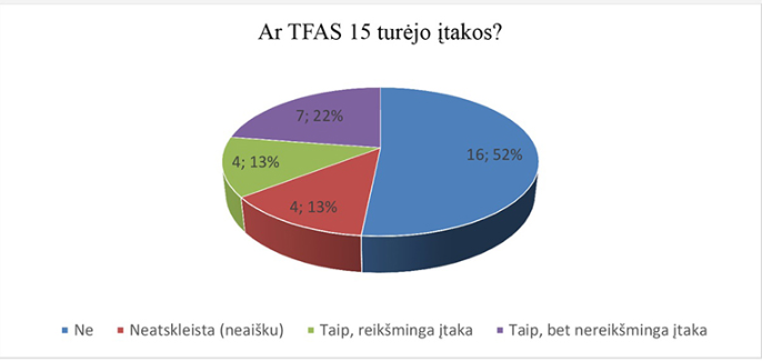 Įtakos (ne) reikšmingumas vertintas dvejopai: analizuota, ar įmonės savo aiškinamojo rašto atskleidime įtaką įvardija kaip ,,reikšmingą” arba ,,nereikšmingą”. Jeigu toks aiškus įvardijimas nepateiktas, tad (ne) reikšmingumas vertintas pagal tai, kokią santykinę įtaką procentais standarto taikymas turėjo pagrindiniams bendrovės finansinių ataskaitų, kuriems įtaką daro 15-asis TFAS, straipsniams (žr. toliau pateikiamą 1 lentelę). Kaip galima matyti iš 3 paveikslo, daugiau negu pusė įmonių (N=16 arba 52 %) teigė, jog standartas apskritai neturėjo įtakos jų finansinėms ataskaitoms. Iš likusiųjų penkiolikos įmonių septynios nurodė, jog įtaka buvo, tačiau nereikšminga (22 %). Įmonės su reikšminga įtaka ir tos, kurios visai neatskleidė standarto taikymo įtakos, pasiskirstė po lygiai – tokių buvo po keturias įmones (13%). Toks atvejų pasiskirstymas parodo, jog standartas paveikė tik mažesniąją dalį analizuotų įmonių, t.y. tik kas aštuntai įmonei standartas turėjo reikšmingos įtakos. Tokia situacija panašiai atspindi straipsnio pirmame skyriuje analizuotą Belgijos įmonių tyrimą, kuriame buvo apibendrinta, jog įmonės nuogąstauja padidėjusio finansinės atskaitomybės intensyvumo, tačiau reikšmingos įtakos skaitine prasme ataskaitoms nesitiki.
