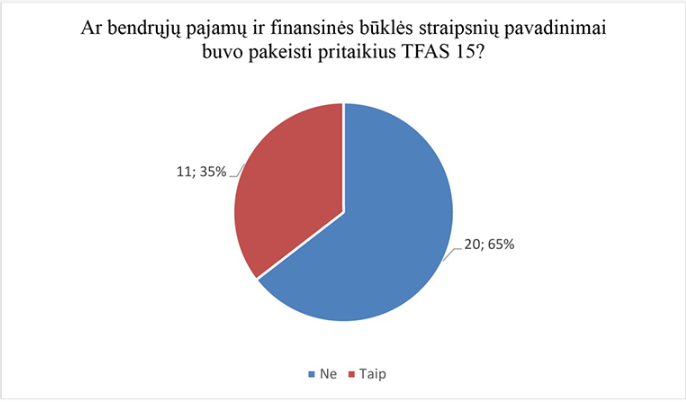 Kitas analizės aspektas, parodantis, kaip TFAS 15 traktavo ir kokius pokyčius padarė jį priimdamos įmonės, yra finansinės būklės ir bendrųjų pajamų straipsnių pavadinimų keitimas. TFAS 15 imperatyviai nenurodo pagrindinėse ataskaitose įvardyti pajamų ir turto bei įsipareigojimų, reglamentuojamų šio standarto, kaip ,,pajamos pagal sutartis su klientais“, ,,sutarčių turtas“ bei ,,sutarčių įsipareigojimai“ atitinkamai. Tačiau jei įmonės šių pakeitimų pagrindinėse ataskaitose nedaro, jos vis tiek turi aiškinamajame rašte aiškiai identifikuoti ir atskleisti, kurios sumos ir likučiai atspindi būtent šias įvardytas kategorijas. Atsižvelgiant į tai, praktikoje dalis įmonių iškart pritaikant TFAS 15 pirmąjį kartą atitinkamai pakeitė pagrindinių finansinių ataskaitų straipsnių pavadinimus. Tačiau, kaip galima matyti iš 4 paveikslo, tokių įmonių buvo mažuma – tik kas trečia įmonė (N=11arba 35 %).