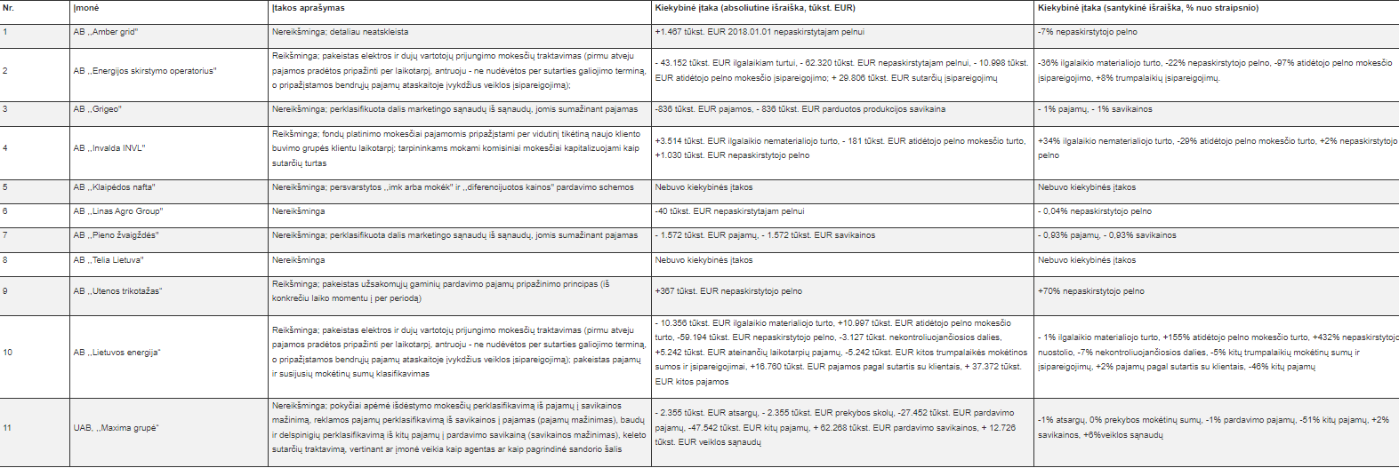 Toliau tyrime buvo nagrinėtos vienuolika įmonių, kurios aiškinamajame rašte nurodė, jog naujasis pajamų standartas turėjo įtakos jų finansinėms ataskaitoms. Šią įtaką kiekybiškai – kiek absoliutine ir procentine išraiška dėl standarto pritaikymo pirmąjį kartą pasikeitė susiję finansinių ataskaitų straipsniai – apibendrina pateikta 1 lentelė (reikšmingos įtakos atvejai lentelėje yra pažymėti):