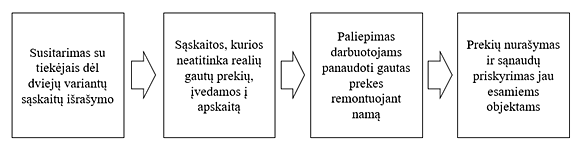 Tiekėjas UAB „3“ pateikė sąskaitos – faktūros Nr. 3 kopiją, kurioje nurodytos skirtingos prekės nei sąskaitoje, esančioje įmonės AB „X“ apskaitoje. Tuo pačiu numeriu pažymėtose sąskaitose nurodytos identiškos sumos ir vienodos bendros sumos – 1528,84 Eur su PVM, tačiau vienoje sąskaitoje nurodytos dailylentės, kurios turėtų būti panaudotos namo remontui. O įmonės apskaitoje užregistruota sąskaita, kurioje nurodyta apipjauta mediena, kurią įmonė galėjo priskirti stalių cechui. Prekės taip pat buvo apskaitytos, kaip medžiagos, išskirstytos į sandėlius ir priskirtos atskaitingiems asmenims bei vėliau visos šios medžiagos buvo nurašytos, tačiau nurašytas medžiagas priskyrė ne objektams, o stalių cechui. Šios sąnaudos buvo įtrauktos į netiesiogines įmonės sąnaudas.