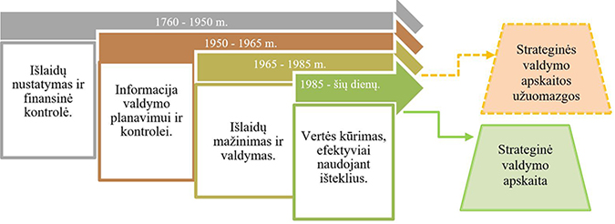 Kaip pažymi Tamulevičienė (2016), pirmosios valdymo apskaitos užuomazgos atsirado kartu su buhalterinės apskaitos atsiradimu. Tačiau aiškesnis valdymo apskaitos elementų, tokių kaip išlaidų nustatymas, taikymas identifikuojamas po 1760 m. Istoriniu aspektu, valdymo apskaitos pradžią galima sieti su pramonine revoliucija, prasidėjusia 1760 m., Didžiojoje Britanijoje. Šiuo laikotarpiu ėmė augti nauja paklausa apskaitos informacijai, kurią skatino įvairūs technologiniai, verslo aplinkos ir operacijų pokyčiai bei spartesnė gamyklų plėtra (Wyatt, 2004; cit. Gliaubicas, 2012, p. 61). Anot Mackevičiaus (2019), ypatingas susidomėjimas valdymo apskaita atsirado XX a. pirmoje pusėje, t.y. kai Vakarų Europos ir Amerikos šalyse, augant gamybos ir prekybos įmonėms bei stiprėjant konkurencijai pastebėta, kad tradicinė buhalterinė apskaita nebetenkina įmonės valdymo poreikių. Nuo 1950 metų buvo siekiama atskirti valdymo apskaitos informaciją valdymo proceso planavimui ir kontrolei užtikrinti. Šiuo periodu buvo aktualu formuoti planus bei atlikti įmonės vidaus bei gamybos proceso kontrolę, tačiau planavimui ir kontrolei skirta valdymo apskaitos informacija nebuvo orientuojama į strateginius įmonių veiklos tikslus. Svarbiu įvykiu laikomas ir 1958 m. naujai sukurtas Amerikos apskaitos asociacijos (angl. American Accounting Association; sutr.AAA) pristatytas valdymo apskaitos apibrėžimas. Pagal jį valdymo apskaita buvo įvardijama, kaip tam tikrų būdų taikymas, apdorojant istorinius bei planuojamus ekonominius duomenis, siekiant padėti valdymo personalui sudaryti teisingus ekonominius planus ir priimti racionalius sprendimus (Amerikos apskaitos asociacija, 1958; cit. Mackevičius, 1994, p.168). Tuo tarpu 1965 – 1985 m. ėmė ryškėti globalinė konkurencija, kurią skatino technologinė pažanga bei gamybos procesų automatizavimas. Šiuo laikotarpiu valdymo apskaitos reikšmė ėmė didėti. Jos paskirtimi tapo informacijos, padedančios vadovams priimti teisingus valdymo sprendimus, surinkimas, klasifikavimas, analizė ir pateikimas (Kaplan, 1982; cit. Mackevičius, 1994, p. 167–168). Nuo 1985 m. įmonės ėmė pastebėti didėjantį verslo neapibrėžtumą. Gamybos, paslaugų ir prekybinės įmonės vykdė veiklą sudėtingoje ir nuolat besikeičiančioje aplinkoje, kurioje susidūrė su ekonominiais pokyčiais, didėjančia konkurencija bei spartesne žinių ir informacijos sklaida. Tai lėmė įvairių įmonių ir organizacijų poreikį naudoti visus turimus instrumentus ir priemones, kurie padėtų išgyventi bei išlaikyti esamą rinkos dalį ar sėkmę (Almaryani, Sadik, 2012). Ši neapibrėžta ir besikeičianti verslo situacija tapo naujos valdymo apskaitos krypties – strateginės valdymo apskaitos – atsiradimo prielaida. Todėl valdymo apskaitos raidos etapą nuo 1985 m. iki dabar galima įvardinti, kaip strateginės valdymo apskaitos formavimosi ir įsitvirtinimo organizacijose etapu.