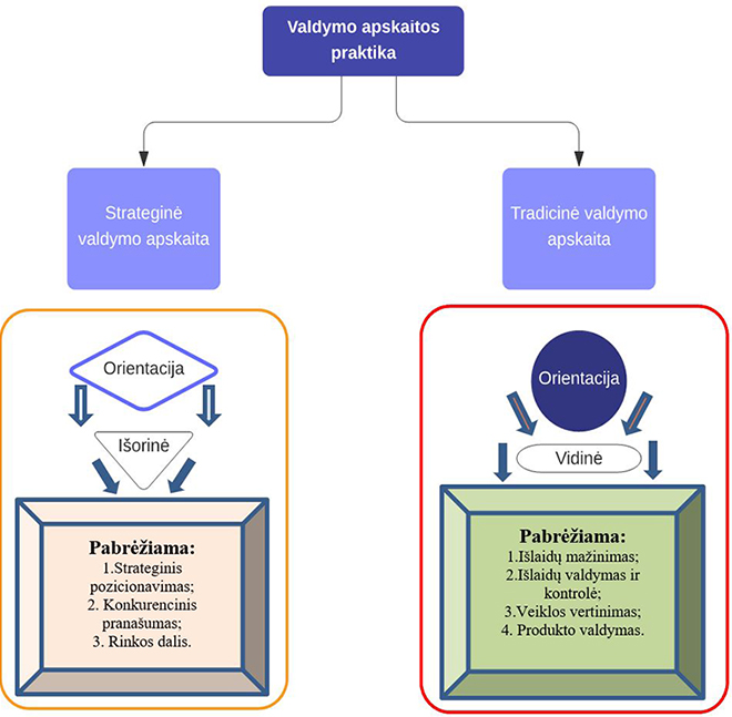 Kitas svarbus veiksnys, vertinant strateginę valdymo apskaitą, yra suvokimas, jog tradicinės valdymo apskaitos būdai labiau pabrėžia išlaidų mažinimą, valdymą ir kontrolę, o strateginė valdymo apskaita apima strateginį pozicionavimą, kai derinama informacija apie klientus, konkurentus ir rinką, kuri leidžia įgyti konkurencinį pranešimą ir padidinti rinkos dalį (žr. 2 pav.).