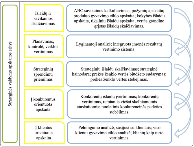 Tradicinė valdymo apskaita yra naudojama renkant, apdorojant, analizuojant ir teikiant informaciją, skirtą planavimui, sprendimų priėmimui ir stebėsenos procesams vykdyti. Tuo tarpu strateginė valdymo apskaita apima informacijos rinkimą, apdorojimą bei analizę, reikalingą strateginiam valdymui, rinkodaros bei kitoms strateginėms ir vadybinėms funkcijoms atlikti. Priešingai tradicinei valdymo apskaitai, kuri yra orientuota į vidinę analizę, strateginė valdymo apskaita didesnį dėmesį skiria išorės ateities veiksnių vertinimui. Vieną iš išskirtinumų galima paminėti, jog strateginė valdymo apskaita apima daugialypę analizę – sudarytą tiek iš finansinių ir nefinansinių tyrimų apie klientus, konkurentus, rinkas ir išorinę aplinką, leidžiančią įmonėms sukurti konkurencinį pranašumą bei pagerinti organizacijų veiklą (Pires, Alves, Rodrigues, 2015, p. 9). Skirtingas strateginės apskaitos sritis nagrinėjo daugelis autorių, tačiau vieną naujausių teorijų parengė Cadez, Guilding (2007, 2008), kurie analizavo tyrimus, orientuotus į konkurentus, ir išskyrė pagrindines strateginės apskaitos sritis, suskirstytas į penkias plačias kategorijas: 1) išlaidų ir savikainos skaičiavimas; 2) planavimas, kontrolė ir veiklos vertinimas; 3) strateginių sprendimų priėmimas; 4) į konkurentus orientuota apskaita; 5) į klientus orientuota apskaita (žr. 3 pav.).