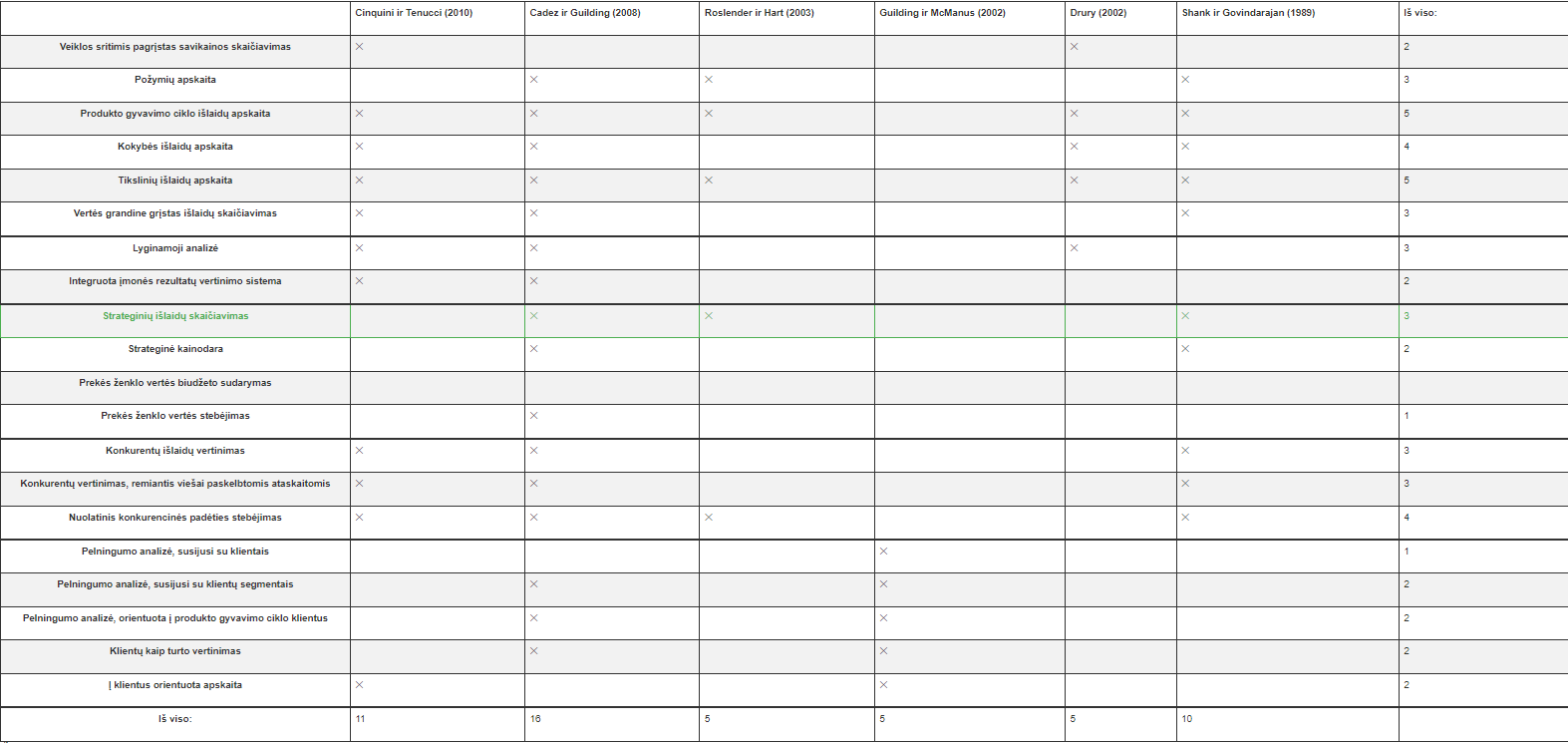 Mokslinėje literatūroje taip pat pastebima, jog Cadez ir Guilding (2008, 2007) išskirtos strateginės valdymo apskaitos sritys ir jų įgyvendinimui taikomi instrumentai buvo nagrinėjami ir kitų autorių (žr. 1 lentelę).