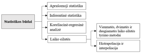 1 paveiksle tarp laiko eilutės tyrimo metodų išskirti ekstrapoliacija ir interpoliacija. Apibendrintai analitinės praktikos – skaičiavimų patirtis tokia: analizuojant laiko eilutę išskiriama dėsningai kintanti dalis ir atsitiktinių priežasčių formuojama dalis. Dėsningai kintanti laiko eilutės dalis yra pavaldi matematiniam dėsniui ir todėl ji prognozuojama. Tokia sudėtinė dalis apskaičiuojama kiekvienam laiko momentui t kaip šio laiko momento t funkcija. Analizuojant parenkama matematinė kreivė, toliau įvertinama pasirinkimo paklaida bei nustatomas laiko eilutės dydis. Apskaičiavus matematinės funkcijos parametrų reikšmes sudaroma prognozė, t.y. atliekamas ekstrapoliacijos veiksmas. Ekstrapoliuojant nustatomos būsimos laiko eilutės reikšmės tiriamuoju laikotarpiu darant prielaidą, kad nustatytas dėsningumas išlieka ir už laiko eilutės ribų. Galima perspektyvinė ekstrapoliacija, kada atliekamas būsimų laiko eilutės reikšmių įvertinimus, arba retrospektyvinė ekstrapoliacija, kada atliekamas buvusių laiko eilutės reikšmių įvertinimus. Literatūroje šiuos klausimus plačiausiai tyrinėja Francis, 1993; Čekanavičius, Murauskas, 2000; Levine ir kt. 2005; Martišius, Kėdaitis, 2010.