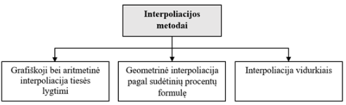 Literatūroje taikomi skirtingi interpoliacijos metodai, priklausomai nuo to, kokio rezultato norima pasiekti (Meijering, 2002; Nareiko, Ruzgienė, Ūselis, 2010 ir kt.). Sekdami A. Rimka, kuris iš lietuvių autorių interpoliacijos klausimams skyrė daugiausiai dėmesio, remiantis jo įžvalgomis siūlome naudotinus finansinėje analizėje interpoliacijos metodus klasifikuoti kaip parodyta 2 paveiksle.