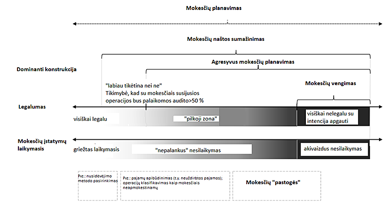 Lietz (2013a) pateikia unifikuotą konceptualią įmonių mokesčių planavimo struktūrą, kur po mokesčių planavimo konstrukcija įtraukia mokesčių naštos sumažinimą, mokesčių agresyvumą, mokesčių vengimą bei mokesčių „pastoges“ (žr.1 pav.).