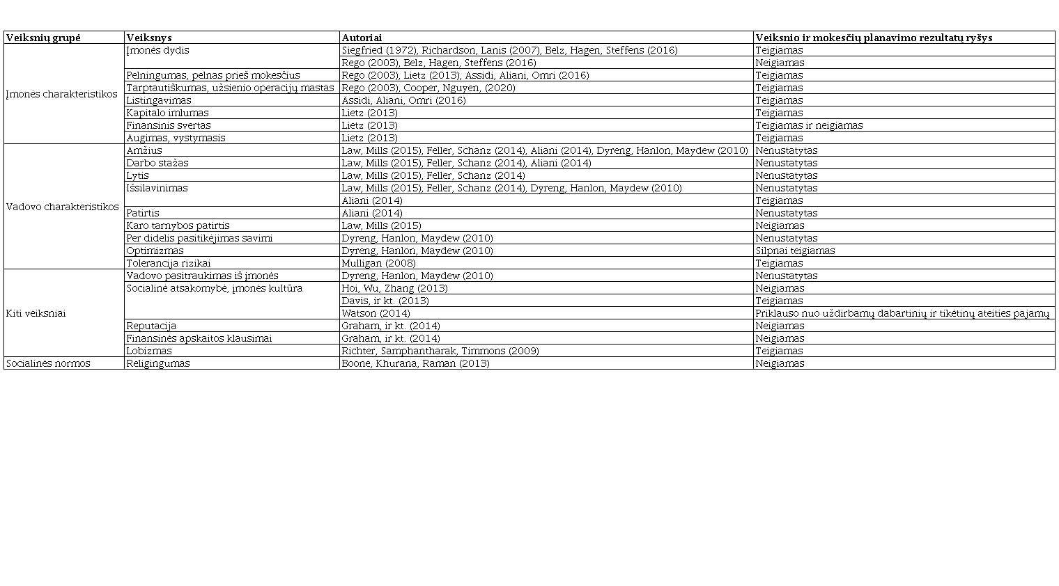 Vertinant veiksnius, lemiančius įsitraukimą į mokesčių planavimo veiklą įmonės lygmeniu, 1 lentelėje išskirtos šios veiksnių grupės: įmonės charakteristikos, vadovo charakteristikos ir kiti veiksniai.