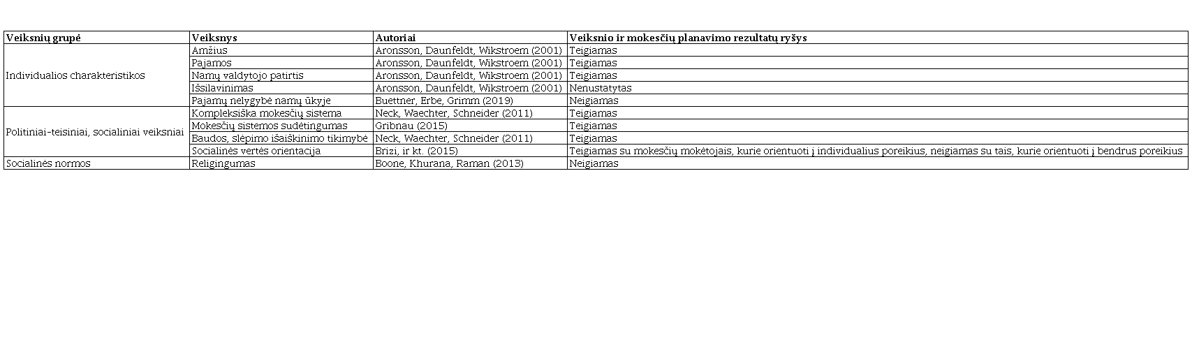 Vertinant veiksnius, lemiančius įsitraukimą į mokesčių planavimo veiklą individo (namų ūkio) lygmeniu, 2 lentelėje išskirtos šios mokesčių planavimą lemiančios veiksnių grupės: individualios charakteristikos bei politiniai, teisiniai ir socialiniai veiksniai.