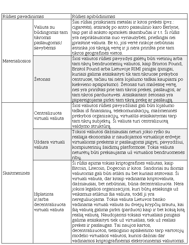 Kriptovaliutos atsiradimas buvo sąlygotas naujų atsiskaitymo formų poreikiu ir alternatyvių valiutų atsiradimu. Alternatyvios valiutos yra skirstomos į materialiąsias ir skaitmenines (žr. 1 lentelę) (Kuo Chuen, Pak Nian, 2015).