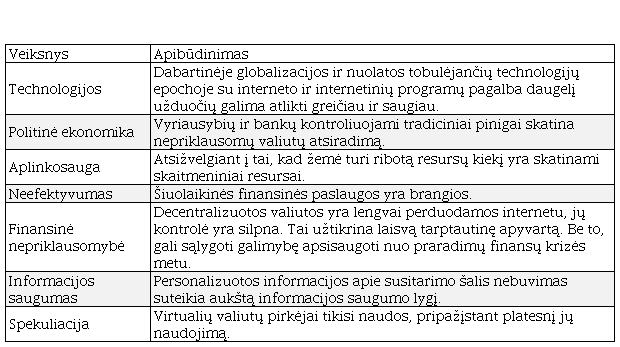 Vertinant kriptovaliutų atsiradimą, svarbu išnagrinėti jų atsiradimą lėmusius ar paskatinusius veiksnius, kurie pateikti 2 lentelėje.