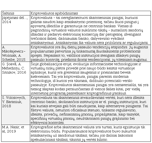 Skirtinguose literatūriniuose šaltiniuose pateikiami kriptovaliutos apibūdinimai pateikiami 3 lentelėje.