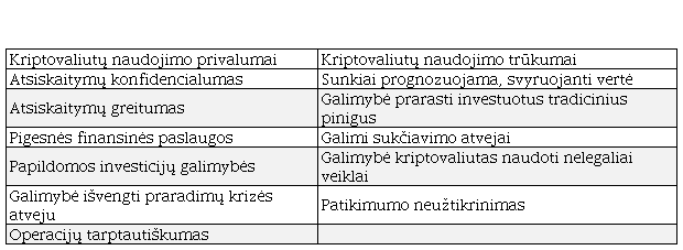 Keywords: kriptovaliuta, kriptovaliutos privalumai, kriptovaliutos trūkumai.