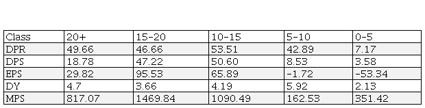 It is observed from the table 9 that the class of PE ratio between 10-15 is the best class in respect of dividend and other market related factors (DPR:53.51%, DPS:50.60%, EPS:65.89%, 4.19%, MPS:1090.49). The extremely lower class (0-5) indicates the worst position of dividend related performance (DPR: 7.16%, DPS: 3.5%, EPS: -53.34%, DY: 2.13, MPS: 351.42).